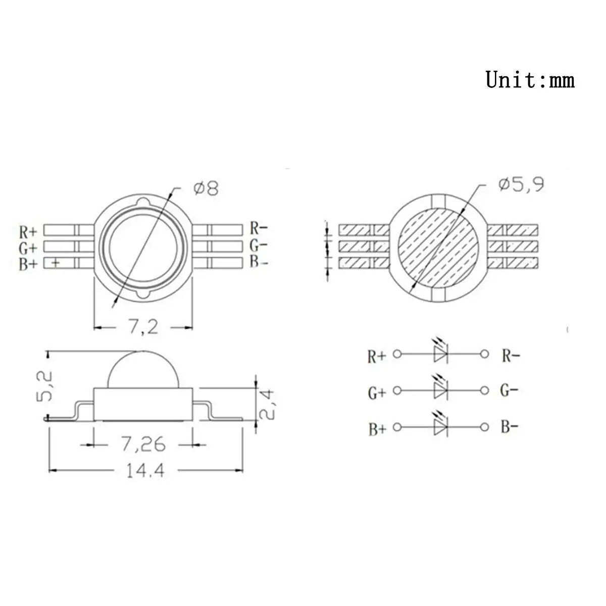 | Forward Voltage | Red(2 – 2.4 V),Green(2.6 – 3.0V), Blue(3 – 3.4 V) |