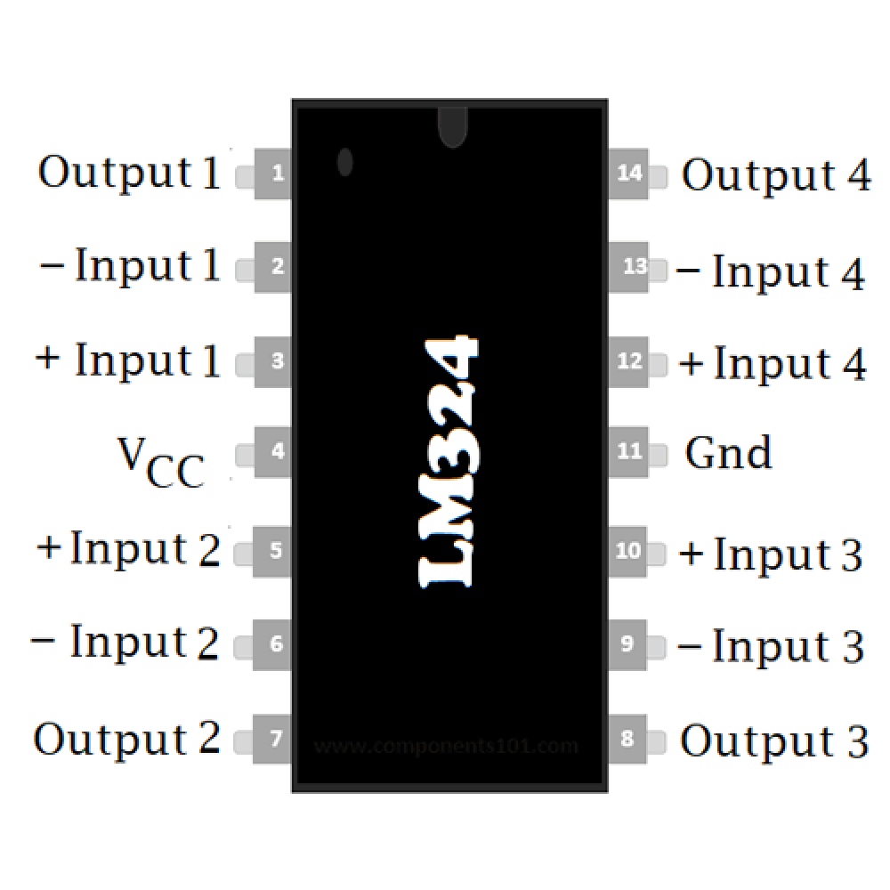 LM324 Low Power Quad Op-Amp IC DIP-14 Package integrated with four op-amps powered by a common power supply. The differential input voltage range can be equal to that of power supply voltage. The default input offset voltage is very low which is of magnitude 2mV. The operating temperature ranges from 0˚C to 70˚C at ambient whereas the maximum junction temperature can be upto 150˚C. Generally, op-amps can perform mathematical operations.