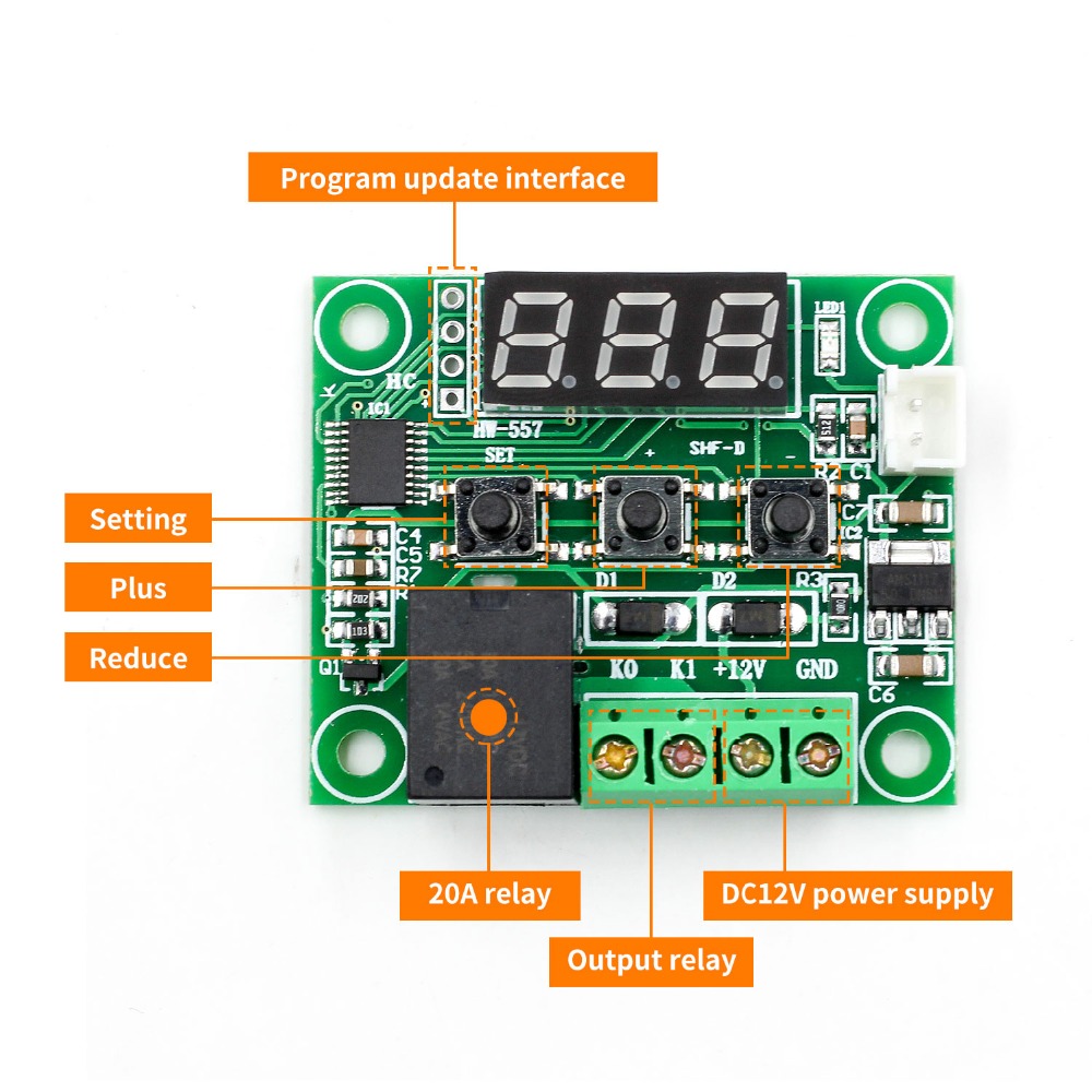W1209 12V Digital Temperature Controller Module is an incredibly low cost yet highly functional thermostat controller. With this module you can intelligently control power to most types of electrical device based on the temperature sensed by the included high accuracy NTC temperature sensor. Although this module has an embedded microcontroller no programming knowledge is required. This also has 3 tactile switches allow for configuring various parameters including on and off trigger temperatures.
